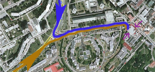 Cesta vás privedie k prvej križovatke, kde odbočíte smerom doprava. Následne sa po vašej pravici bude nachádzať najskôr hypermarket HYPERNOVA a potom TESCO. Pri druhom menovanom hypermarkete sa dostanete k veľkej križovatke so svetelnou signalizáciou. Vaša cesta bude pokračovať rovným smerom. Po vašej pravici budete vidieť mestskú Plaváreň. Asi po 400 metroch sa dostanete k podstatnému bodu a to ku križovatke bez svetelnej signalizácie. Teraz odbočíte doľava na smer do centra, kde už uvidíte dominantu moderne reštaurovaného Mlynu a o cca 200 metrov z boku vchod do Bowling Dance Clubu.