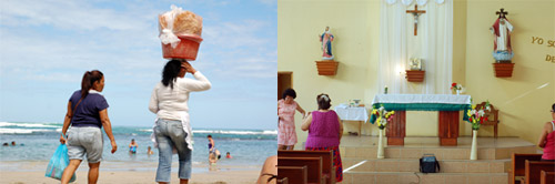 Obrázok vľavo- chodiaci pobrežný obchod. Iba okolo človeka prejdú, príp. sa usmejú, ale nikdy nikoho na kúpu nenahovárajú. Turci, Egypťania, či Tunisania by sa mali čo od nich učiť. Obrázok vpravo- kostolík, v ktorom omša býva iba raz do týždňa, v nedeľu o tretej. Namiesto podávania ruky sa tam ľudia objímajú
