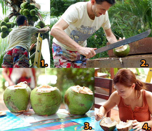 2. deň- po tom ako sa Peťo naučil ako zúžitkovať kokosy (ktorých je všade asi miliarda), sme vedeli, že prežijeme, aj keby sa stratíme a okradnú nás. Nasadli sme na bicykle a užívali si cestu hotovou botanickou záhradou na jednu z krásnych pláží. Cestu nám spríjemňoval spevokol rôznych živočíšnych tvorov a cestou späť sa nám podarilo zazrieť aj našich predchodcov- opice