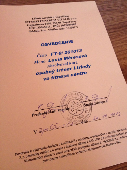 Zúčastnila som sa kurzu osobného trénera, ktorý som práve túto sobotu (26.10.2013) zavŕšila záverečnou skúškou. Naučila som sanielen čo je to bench press, chest press, pull over (pre tých čo nevedia, cviky na strojoch v posilke