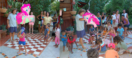 . 7. deň - boli sme pozvaní na oslavu krásnych piatich narodenín. Oslava ako z amerického filmu - 25 detí jašiacich sa vo veľkom bazéne, na preliezkach, trampolíne, potom pizza, torta a na záver rozbíjanie "piňaty" (papierového koňa, z ktorého vypadla miliarda cukríkov). Viac ako oslávenkyňa Laura si to užíval Peťo. Vždy vraj chcel zažiť to rozbíjanie koňa